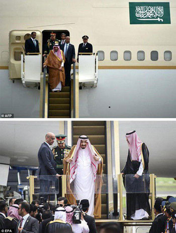 هواپیمای بویینگ 747 پادشاه عربستان در فرودگاه با پلکان طلایی مورد استفاده او قرار گرفت. قبل از پرواز هواپیمای او دو هواپیما محموله چند صد تنی بارهای او را که شامل فرش، بشقاب و دو مرسدس بنز ضد گلوله هستند به محل تعطیلات بردند.