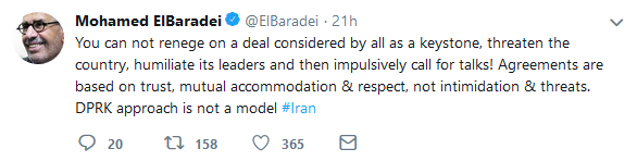 مدیر کل پیشین آژانس بینالمللی انرژی اتمی در صفحه توئیتر خود خطاب به دونالد ترامپ نوشت: نمیتوانی توافقی را که از نظر همه یک دستاورد بزرگ است از بین ببری، کشوری را تهدید کنی، رهبرانش را تحقیر کنی و سپس ناگهان خواستار گفتگو شوی. پیمانها بر اساس اعتماد، همکاری متقابل و احترام شکل میگیرند و نه تهدید و ارعاب. رویکرد کره شمالی مدلی برای ایران نیست.