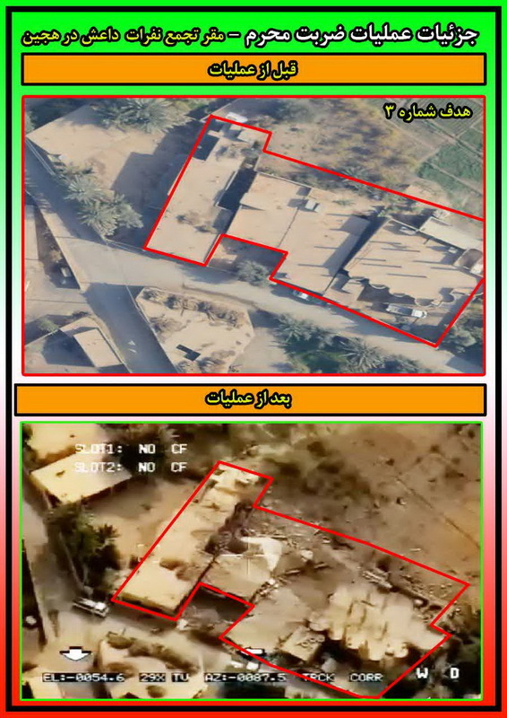 خبرگزاری صداوسیما به نقل از سپاه نیوز؛ پس از حمله موشکی و پهپادی سپاه به مقر تروریستهای تکفیری که منجر به هلاکت و زخمی شدن شمار زیادی از تروریستها و سرکردگان جنایت تروریستی اهواز گردید، نیروی هوافضای سپاه نخستین تصاویر از محلهای اصابت موشکها وبمباران پهپادهای رزمی در شرق فرات در سوریه را رسانهای کرد.