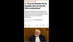 ظریف: این یک فاجعه برای اروپایی‌هاست که نوکر آمریکا باشند. هر کسی که یک جانبه‌گرایی را بپذیرد به آن‌ها (آمریکا) کمک می‌کند. اروپایی‌ها به ما می‌گویند ببخشید ما نمی‌توانیم کاری انجام دهیم. اروپایی‌ها نمی‌توانند در برابر ترامپ سر خم کنند و در عین حال نقش یک فرد قوی را در برابر ایران بازی کنند.