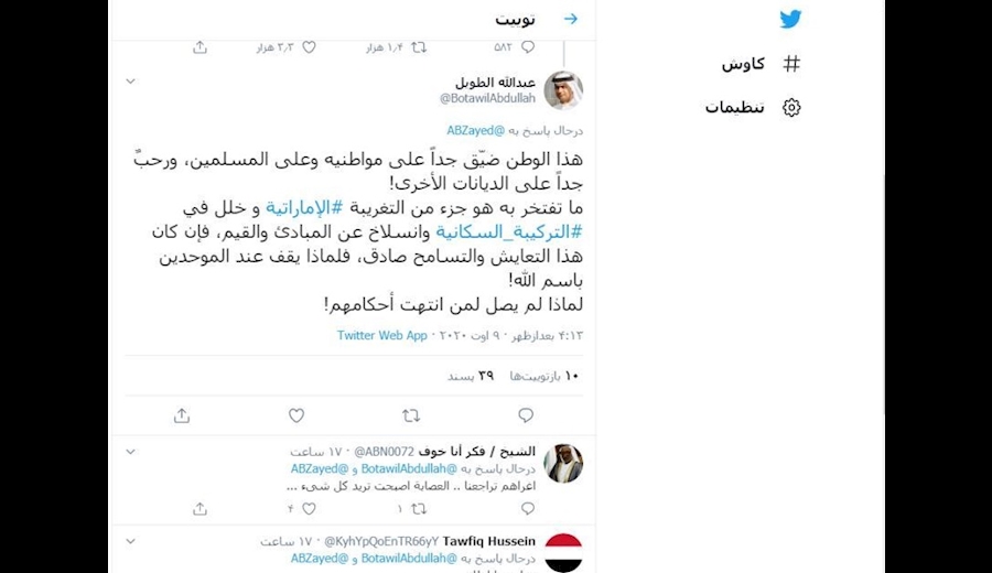 عبدالله الطویل، مخالف اماراتی در توئیتی نوشت: در کشور، جا برای شهروندان و مسلمانان بسیار تنگ شده و از ادیان دیگر استقبال چشمگیر شده است!.