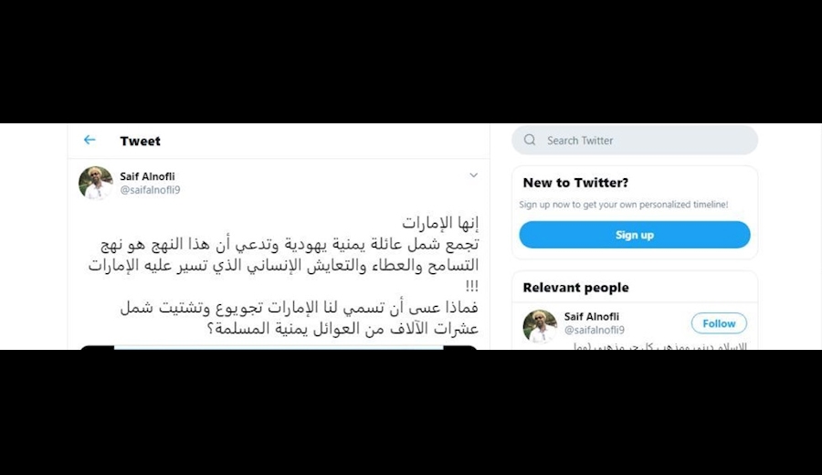سیف النوفی نیز در توئیتی نوشت: امارات یک خانواده یمنی یهودی را دور هم جمع و ادعا میکند این همان رویکرد تسامح و همزیستی است که همواره آن را در پیش میگیرد,، اما در قبال گرسنه نگهداشتن و پراکنده کردن دهها هزار خانواده مسلمان یمنی چه پاسخی دارد.