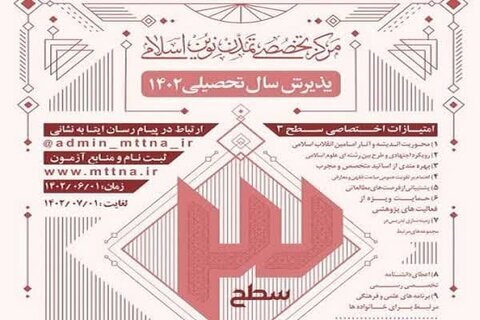 این مؤسسه همچنین در رشته «فرهنگ، هنر و تمدن اسلامی» با اعطای رسمی مدرک «سطح ۲» اقدام به پذیرش طلبه کرده است و علاقه‌مندان برای کسب اطلاعات بیشتر در این باره هم می‌توانند به نشانی؛ Mttna_ir@ و برای ثبت نام به آدرس www.mttna.ir مراجعه کنند.