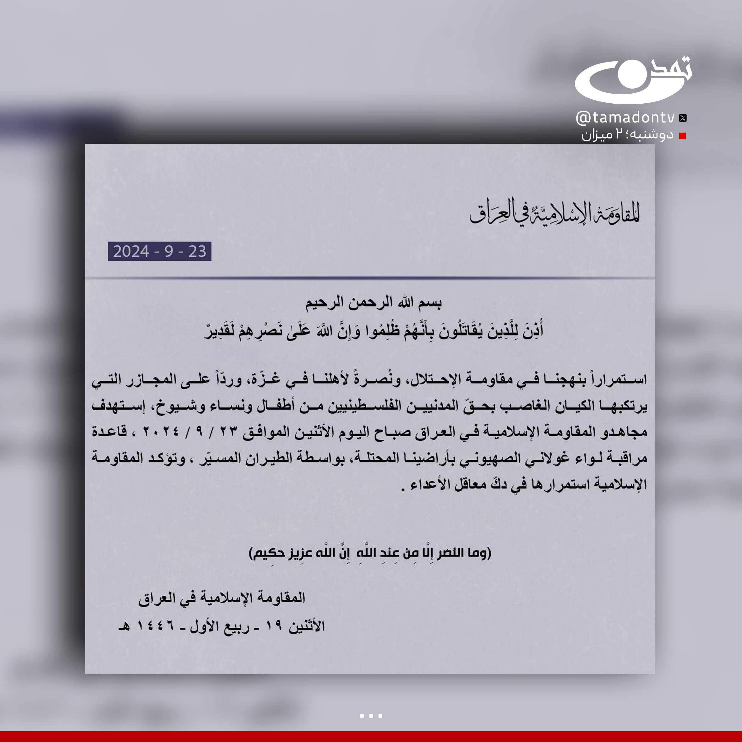 شبکه تلویزیونی العالم گزارش داد، مقاومت اسلامی عراق اعلام کرد پایگاه نظارتی تیپ گولانی را در سرزمین‌های اشغالی با پهپاد هدف قرار دادیم